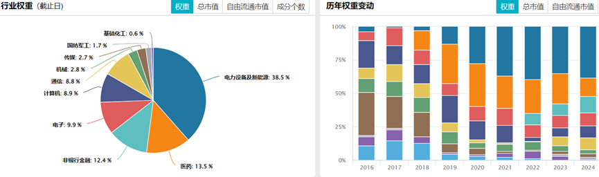 在当前我国经济新旧动能转换,大力推动发展新质生产力的背景下,创业板50指数紧密跟随产业结构升级历程,持续聚焦“新质生产力”。从行业结构变化来看,传统行业如机械、化工等在创业板龙头公司中的占比降低,而电力设备及新能源、医药、电子、计算机、通信等含“新”量较高的行业占比提升。截至2024年末,这些新兴行业分别占比达38.5%、13.5%、9.9%、8.9%、8.8%,合计占比近80%。
