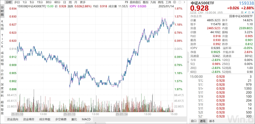 大智慧数据显示,中证A500ETF(159338)上市以来,截止1月14日,成交额高达1931亿元,日均成交约30亿元,活跃度非常高。