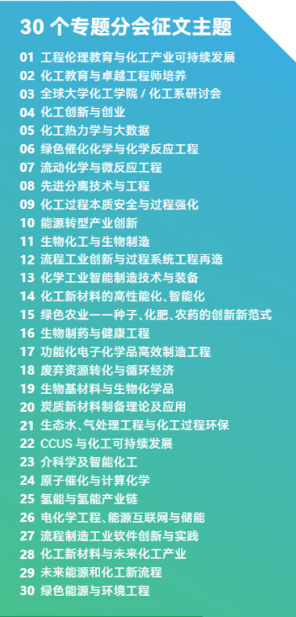 大会以“迎接全球挑战的化学工程范式变革”为主题,将紧跟全球科技新领域发展脉搏,针对化工发展面临的颠覆性挑战,设置四大主要议题:化工与教育培训、化工与基础产业再造、化工与战略新兴产业、未来化工与智慧创新,组织30余个分会场,600余场发人深省的前沿报告与丰富多彩的交流研讨,汇聚全球顶尖科学家共享前沿技术与开创性研究成果,深入探讨传统化工产业如何适应新的需求转型升级,如何培育新兴产业和未来产业,如何以创新的发展范式促进新质生产力的发展,如何培养适应产业变革的新一代化工工程师……将有来自全球化工领域学术界、科技界、产业界的顶尖科学家、诺贝尔奖获得者、跨国公司领袖、国际组织、国家及相关部门领导人、海内外产学研各界知名人士在内的几十余个国家与地区的5000余名代表共襄盛会,共享前沿技术与开创性成果,共同推动全球化工科技的繁荣与发展。