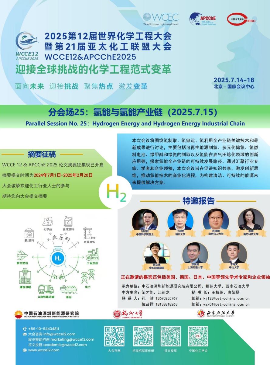 2025年7月,全球化工领域历史悠久、学术领先的“奥林匹克级别”盛会--四年一届的2025世界化学工程大会(WCCE 12)将首次在中国召开,同期将举办第21届亚太化工联盟大会(APCChE 2025)与2025中国化工学会年会。