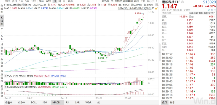 港股科技股ETF(513020)年后以来截止2月21日盘中,量价齐升,涨幅超30%,并在今日盘中创了新高,报1.158元,领涨市场。