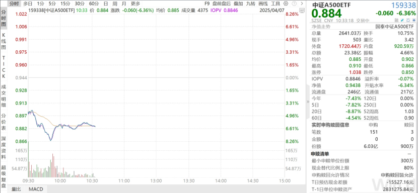 美国“对等关税”政策冲击引发全球股市巨震,全球股市均出现大跌。A股早上开盘一度跌幅超7%,后跌幅略有收窄。值得关注的是,资金趁着大跌之际,对中证A500ETF(159338)速度加仓,开盘仅半小时获净申购近6亿份。