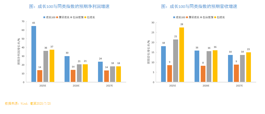 成长100与同类指数历史增速与当年增速的对比(截至2025年7月)
