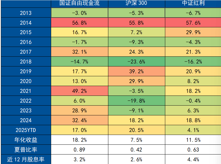 从收益表现上看,国证自由现金流指数长期收益表现优异,2013年以来年化收益18.2%;高于中证红利的11.5%,且在高收益的前提下波动较低,风险收益比出色。分年度来看,指数自发布以来在过去13年中有10年录得正收益,在下行市中韧性凸显,在上行市中也有不错的收益,可以做到穿越周期。