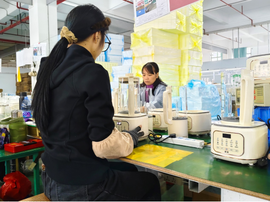 为保障产品质量,工人在破壁机打包发货前对各项功能稳定性进行再次检测。曾邵|摄